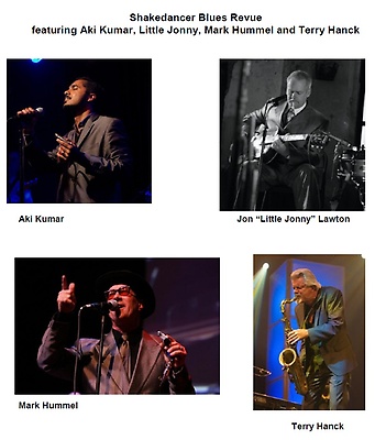 The Shakedancer Blues Revue includes Aki Kumar, powerhouse harp player and producer; Little Jonny (aka Jon Lawton), known for his guitar and vocals; Mark Hummel, Grammy Award nominee and Blues Music Award winner on the harmonica; and Terry Hanck, Blues Music Award winner and known for tenor saxophone and vocals. Each will have CDs available for purchase.