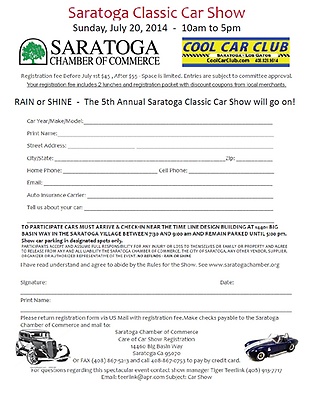 Sponsored by the Saratoga Chamber of Commerce and the Cool Car Club of Saratoga, Los Gatos and Campbell, the event runs from 10 AM to 5 PM on Sunday, July 20.