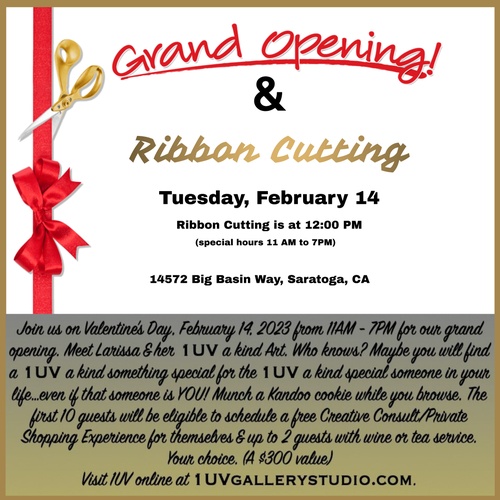 Join us and welcome 1UV Gallery/Studios to Saratoga on Tuesday, February 14. The Ribbon Cutting will begin at 12 PM, but the gallery will be open from 11 AM - 7 PM.