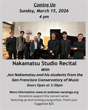 Jon Nakamatsu, internationally renowned pianist and faculty member at the San Francisco Conservatory of Music, will bring eight of his students for this special recital, showcasing the artistic talents of the next generation. All will play on the church's Imperial Bosendorfer Grand Piano, known for its deep, resonant sound and projection in large spaces -- an instrument usually only available in concert halls. Students will perform a variety of selections from a range of composers, including J.S. Bach, Franz Liszt, Robert Schumann, and W.A. Mozart. Additionally, Jon Nakamatsu will perform. All donations graciously accepted to support the costs of the concert. Thank you!