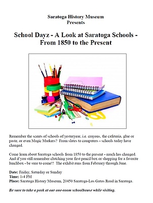 Memories of school days can be enjoyed at the Saratoga History Museum opening February 15- end of June.Visitors will enjoy the photos and artifacts that marked Saratoga's beginnings going back as far as 1850. Memorabilia includes photos, desk and globe, lunch boxes and yearbooks. The exhibit traces some of the changes in today's curriculum and includes all the current Saratoga schools.